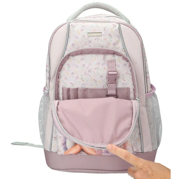 TOPModel Sac à dos scolaire BLOOMING KITTYLe devant de sac à dos pour l’école TOPModel de couleur lilas présente un grand motif mannequin et chat et, autour ainsi que sur les bretelles réglables un délicat imprimé fleurs. Avec des détails de couleurs violet pailleté et sauge, un dos matelassé, un dessous imperméable et antidérapant, des poches latérales en filet, des réflecteurs, une poche avant, un compartiment principal et une poignée. Matière principale : 100 % polyester-