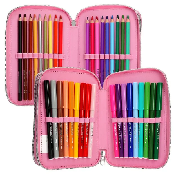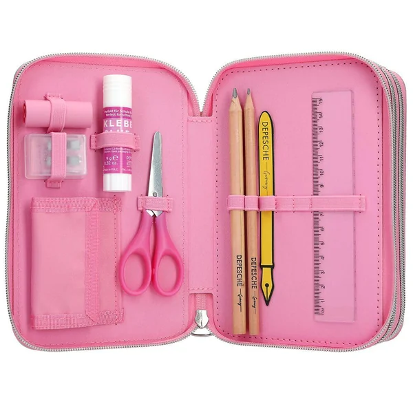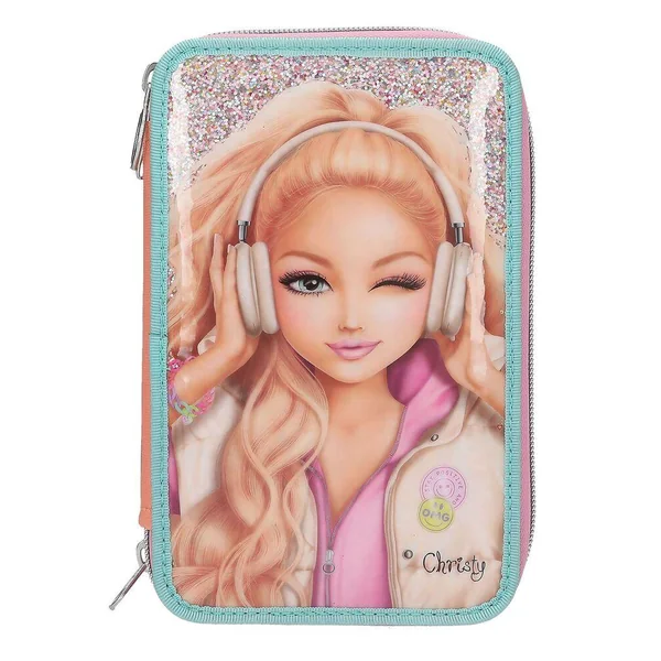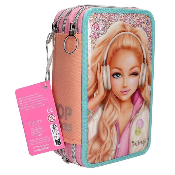 TOPModel Trousse 3 niveaux MUSICCette trousse TOPModel est une vraie star : des éléments de couleurs rose vif, abricot et turquoise, un devant recouvert de paillettes colorées et un grand motif de mannequin avec un casque cool. Les trois compartiments séparés à fermetures éclair sont remplis de 18 crayons de couleur et 18 feutres, 2 crayons à papier, un taille-crayon, une gomme, une règle, des ciseaux, un bâton de colle et une petite pochette à fermeture velcro. Matière principale : 100 % polyester-