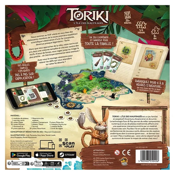 La technologie Scan & Play permet de mêler composantes numériques et jeu de plateau traditionnel, offrant ainsi une expérience interactive enrichie par un matériel admirablement illustré. Fouillez l’île en quête de ressources, confectionnez de nouveaux outils, découvrez des espèces endémiques dont la science ignore tout… et donnez-leur un nom !