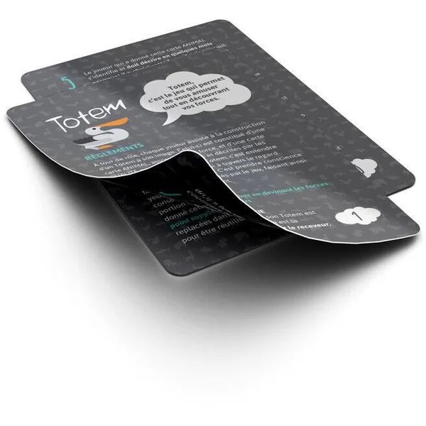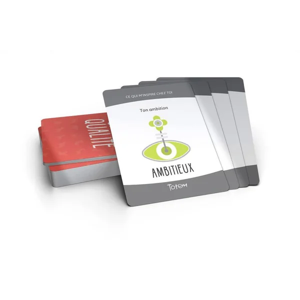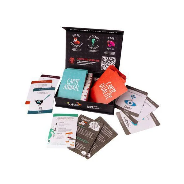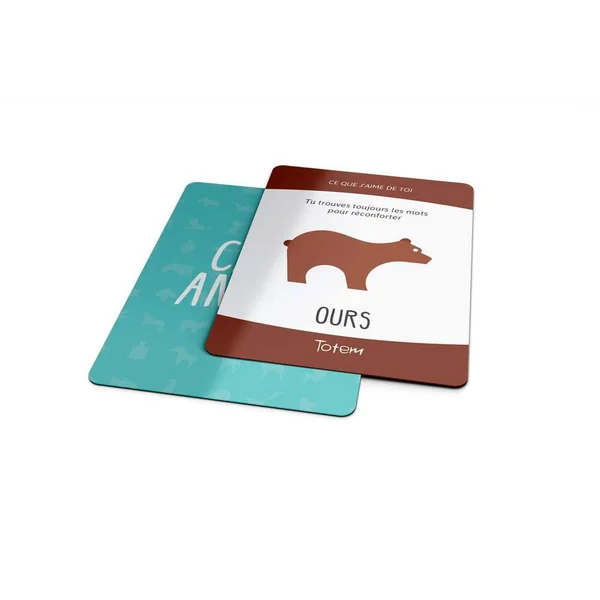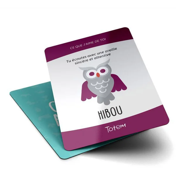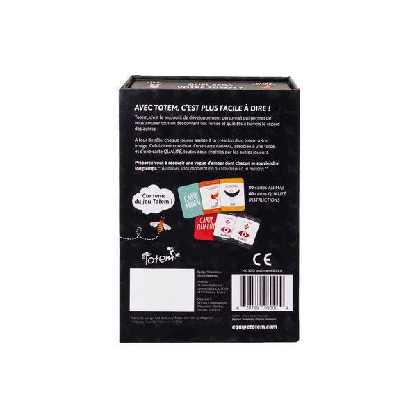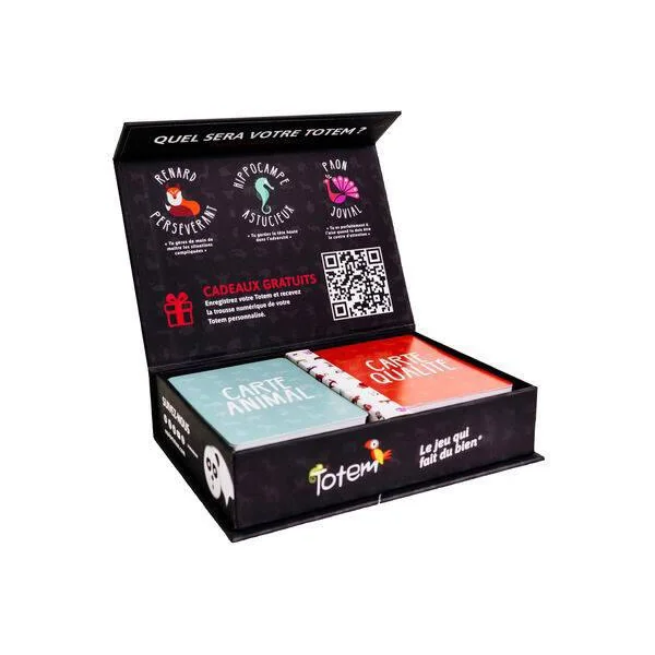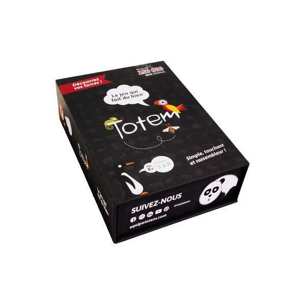 Imaginez que vos amis, votre famille ou vos collègues vous disent ce qu’ils apprécient le plus de vous. Totem, le jeu qui fait du bien, est le jeu de cartes qui permet de vous amuser, tout en découvrant vos forces et qualités à travers le regard des autres. À tour de rôle, chaque joueur assiste à la création d’un totem à son image. Celui-ci est constitué d’une carte Animal associée à une force et d’une carte Qualité, toutes les deux choisies par les autres joueurs, qui voient peut-être en vous une étincelle insoupçonnée. Préparez-vous à recevoir une vague d’amour dont chacun se souviendra longtemps. Nombre de joueurs 3 à 8 – Durée de la partie 30 minutes à 1 h.