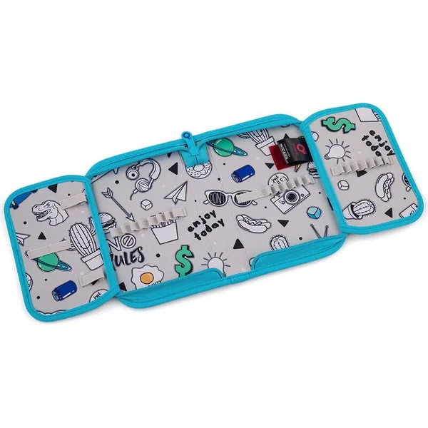 La trousse scolaire à une chambre avec deux rabats est équipée de 21 supports en caoutchouc classiques pour crayons et feutres, de trois supports plus larges pour règles, compas ou ciseaux, et de deux plus grands supports pour gomme et taille-crayon.
