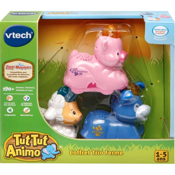 Un coffret de 3 animaux trop mignons qui roulent, parlent et chantent, contenant Tire-bouchon, le cochon glouton, Frisette, le mouton à bouclettes et Chardon, l’âne à chansons. Déclenchement de chansons, mélodies et sons amusants quand : on appuie sur le bouton lumineux de la tête articulée, quand l’animal roule ou quand l’animal passe sur une « Zone magique » (univers Tut Tut Animo et Tut Tut Bolides). Les Tut Tut Animo accompagnent Bébé dans ses premières découvertes : nom et particularités de l’animal, développement de la motricité fine. 3 chansons, 6 mélodies et sons réalistes par animal inclus. Pile de démonstration fournie