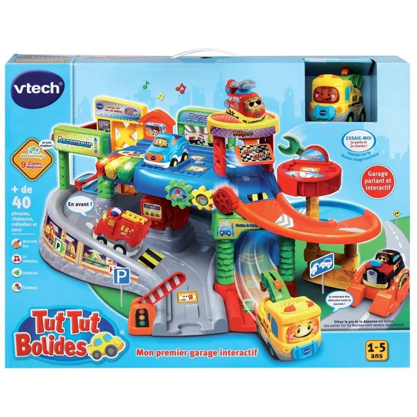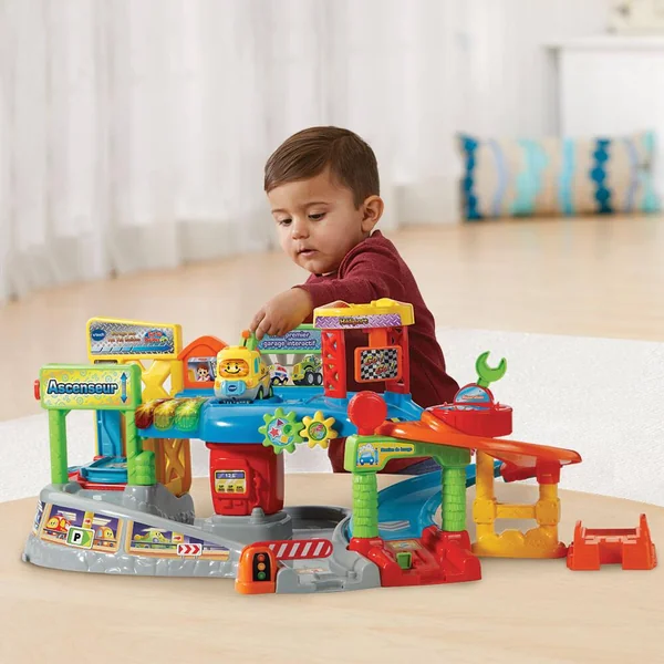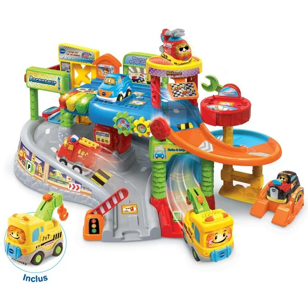 Il s’agit d’un garage miniature en plastique conçu par la marque VTech. Le garage comporte un circuit équipé d’un ascenseur, d’effets lumineux et sonores.