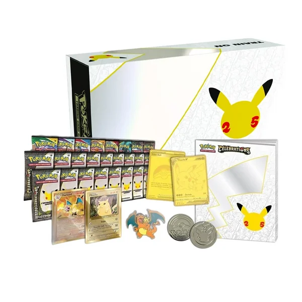 Célébrez les 25 ans de Pokémon avec deux des Pokémon emblématiques adorés du monde entier. Cette incroyable collection contient un énorme set de boosters Célébrations du JCC Pokémon, ainsi que des cartes souvenirs en métal de Pikachu et de Dracaufeu présentant ces Pokémon sous leur apparence d’origine dans le JCC Pokémon. Ce n’est pas tout ! Vous trouverez également un guide des mécaniques du jeu depuis les débuts du Jeu de Cartes à Collectionner Pokémon, des cartes promo dorées étincelantes et texturées d’une Poké Ball et de Pikachu-V à utiliser en jeu, d’autres surprises dans de nombreux boosters du JCC Pokémon, et plus encore !
