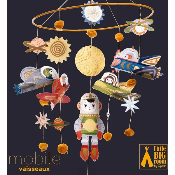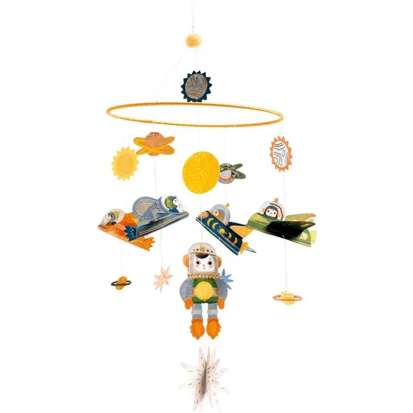 Décolage imminent ! Avec ses vaisseaux spatiaux, ses planètes et son cosmonaute, ce mobile sur le thème de l’espace est un bel objet pour décorer une chambre d’enfant. Déjà assemblé, il n’y a plus qu’à le fixer et admirer les éléments voleter dans les airs. La collection Djeco Mobiles, une rencontre poétique et aérienne entre deux mondes, le design et l’illustration. Un subtil jeu d’équilibre entre rêve et réalité.