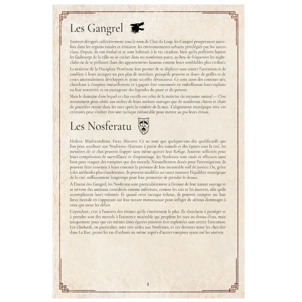 Quand le loup hurle et que le rat rôde, aucun mortel n’ose se rendre dans les parcs après la tombée de la nuit, et les mendiants parlent à voix basse d’étranges bienfaiteurs évoluant parmi eux, alors même que leur nombre diminue mystérieusement nuit après nuit. Partageant un lien avec les animaux, mais divisés par des loyautés opposées, les Gangrel et les Nosferatu de la cité cherchent la moindre occasion de déchaîner la Bête qui est en eux afin de donner libre cours à l’aspect le plus sauvage des vampires.
