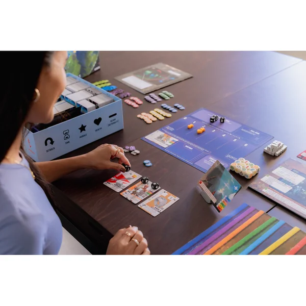 Vantage est un jeu d’aventure coopératif en monde ouvert pour 1 à 6 joueurs, conçu par Jamey Stegmaier. Vantage propose l’exploration d’une planète entière, où les joueurs communiquent entre eux tout en étant dispersés aux quatre coins du monde. Avec près de 800 lieux interconnectés représentés sur des cartes et plus de 900 autres cartes à découvrir, le monde devient votre terrain d’exploration.