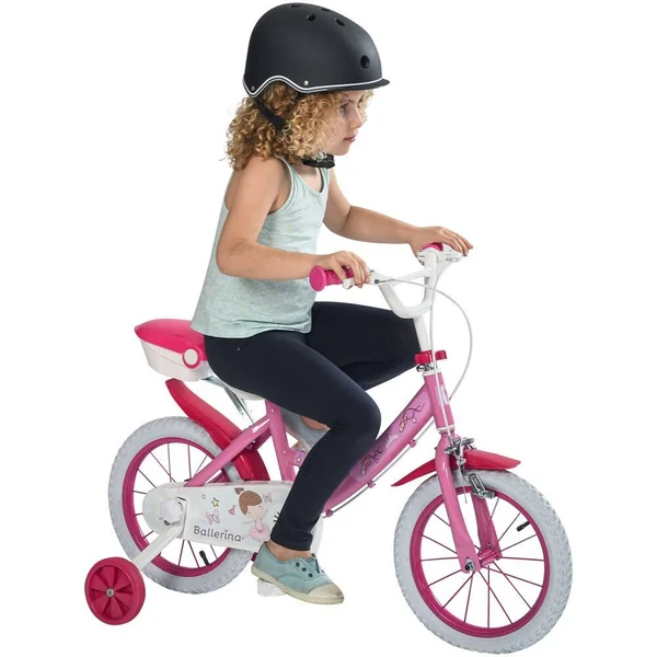 Vélo 14 pouces BALLERINA. Cadre et fourche en acier. Equipé d’un frein avant de type Calliper, d’un frein arrière de type tambour. Roue libre. Roues à rayons et pneus gonflables. Selle souple et ergonomique. Jantes acier. Avec des garde boue. Equipé de stabilisateurs à montage sans outils. Avec un kit d’éclairage, piles boutons fournies : 2 piles CR2032 à l’avant et 2 piles LR44 à l’arrière. Catadioptres sur roues. Avec sonnette. Avec un coffre à l’arrière et un panier à l’avant. Planche autocollants prénom incluse. Guidon réglable de 62 à 68 cm. Selle réglable de 51 à 56 cm. Roulements PP type PA30FV. Pédales avec réflecteurs. Poids maximum de l’utilisateur : 36 kg. Pour enfant de 1.00 à 1.10 m. 4-6 ans. Norme ISO 8098. Assemblage 95 %. Vélo contrôlé et approuvé par les laboratoires AIJU en Espagne. Licence : Ballerina.