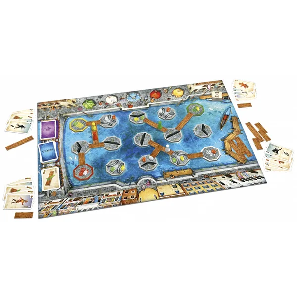 Vous représentez chacun une couleur et avez 4 pierres précieuses à ramasser : rubis pour le rouge, diamants pour le blanc, émeraudes pour le vert et topazes pour le jaune. Vous disposez d’un stock de planches qui vous permettra d’aller de pilotis en pilotis. La partie est gagnée par le joueur qui récupère en premier les 4 pierres précieuses de sa couleur.