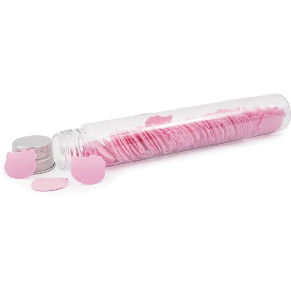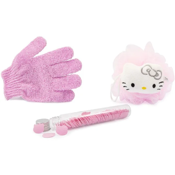 Ce set contient : un gant exfoliant rose fuchsia, une éponge de bain rose pâle décorée avec la tête d’Hello Kitty et des confettis de bain en forme d’étoiles rose à la senteur vanille. ; Non fournies