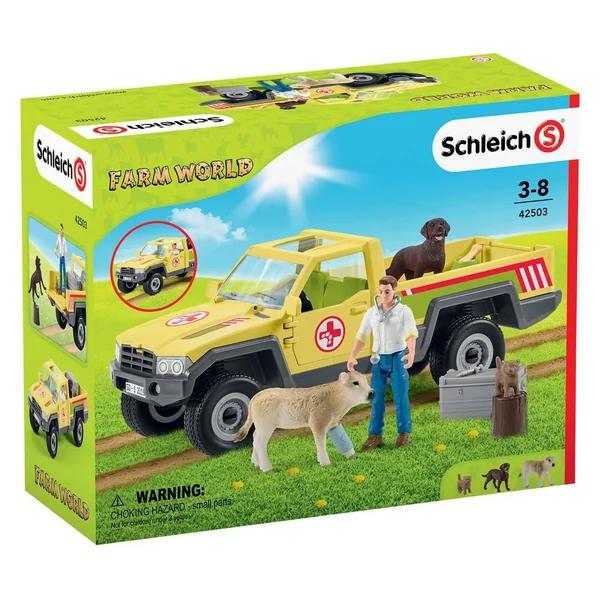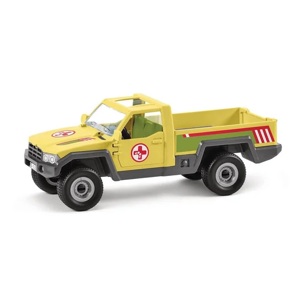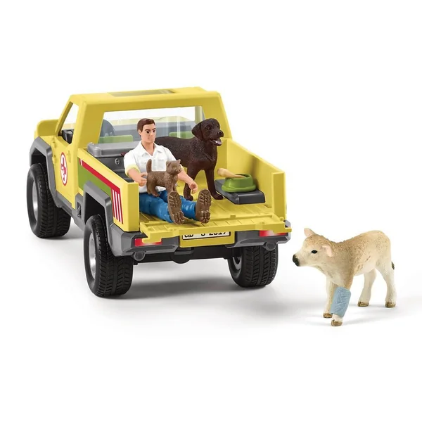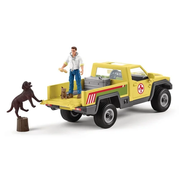Comprend 1 véhicule à roues libres, 1 personnage, 3 animaux et des accessoires. Les portes du véhicule s’ouvrent.