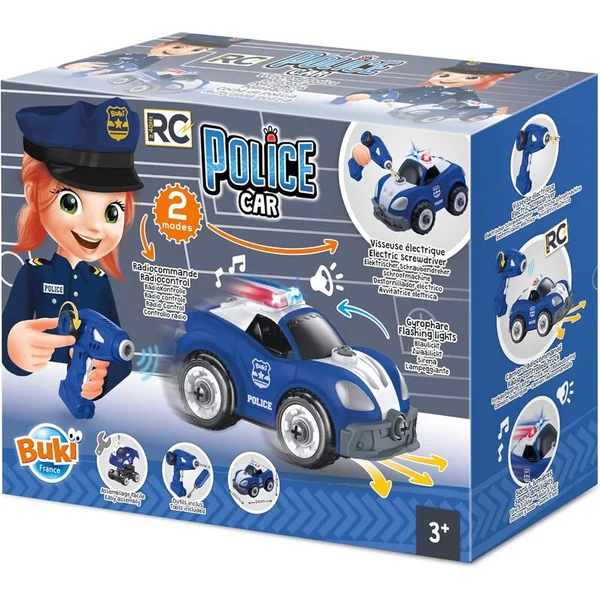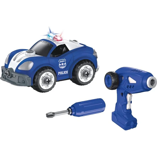 Kit de voiture de police télécommandée que l’enfant assemble lui-même. Comprend un tournevis électrique servant également de télécommande. La voiture peut avancer, reculer, tourner à gauche et à droite.