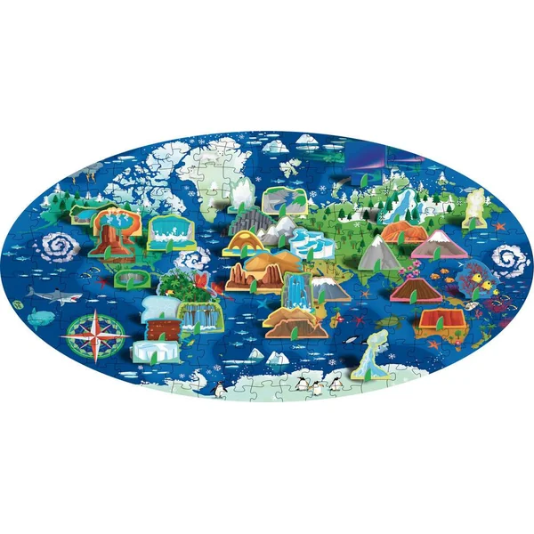 La Terre regorge de beautés naturelles : des cimes des montagnes enneigés jusqu’aux profondeurs des océans, en passant par les déserts les plus reculés, la nature a parsemé mille merveilles aux quatre coins de notre planète. Partons à la découverte des plus belles d’entre elles ! Contient : 1 puzzle ovale de 200 pièces (90 x 60 cm), 32 silhouettes et 1 poster.