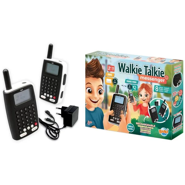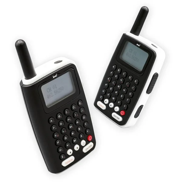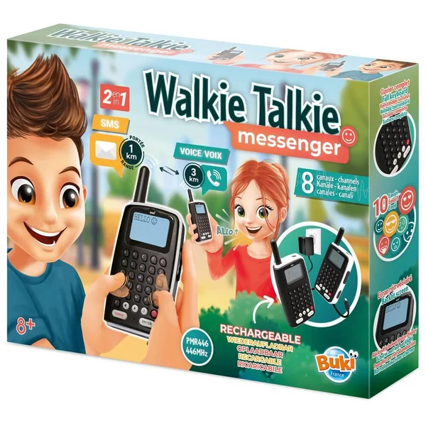 Une paire de talkie walkie pour parler et s’écrire des messages Ils peuvent s’envoyer des messages et des émojis grâce aux claviers et à l’écran rétroéclairé Portée de 1 km pour les messages et pour 1,5 km pour la voix.