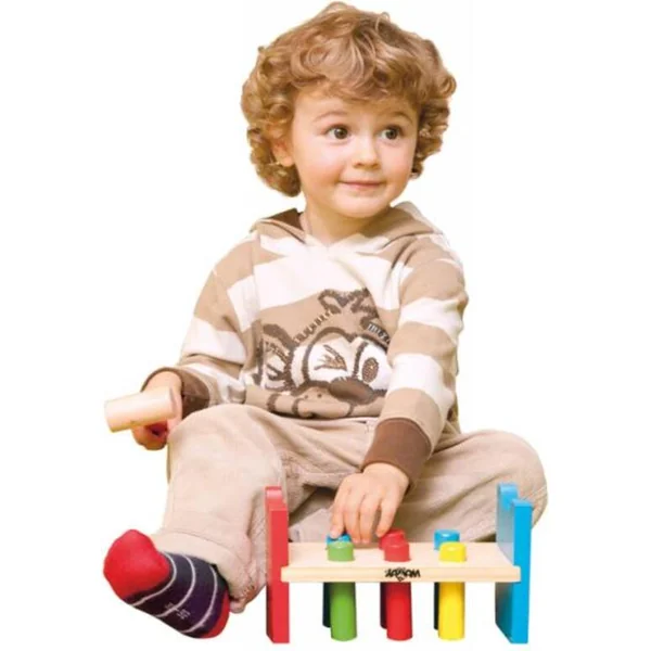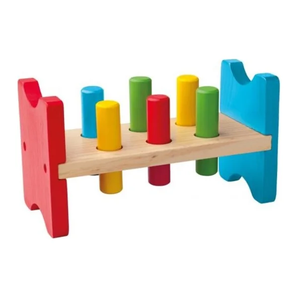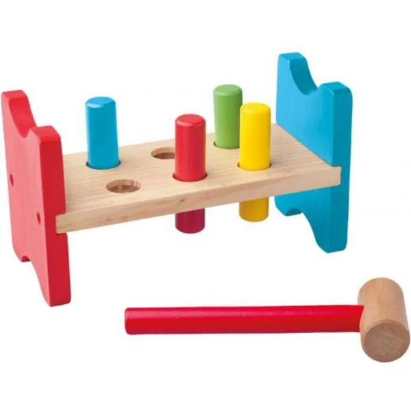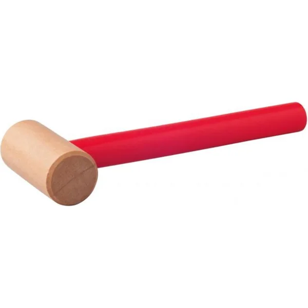 Marteau en bois de la société Woody. L’intérieur des trous pour les chevilles est bordé de caoutchouc afin que les chevilles ne glissent pas, mais en même temps ne créent pas trop de résistance. Hauteur 12 cm, largeur 21,5 cm. Destiné aux enfants à partir de 2 ans.