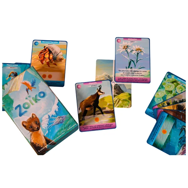 Zoïko est un jeu de société dans lequel tu fais prospérer des écosystèmes, parmi la forêt, la mer, la rivière et la montagne, en les peuplant d’animaux et de plantes. À chaque tour, tu peux créer un territoire, le peupler ou faire se reproduire tes espèces