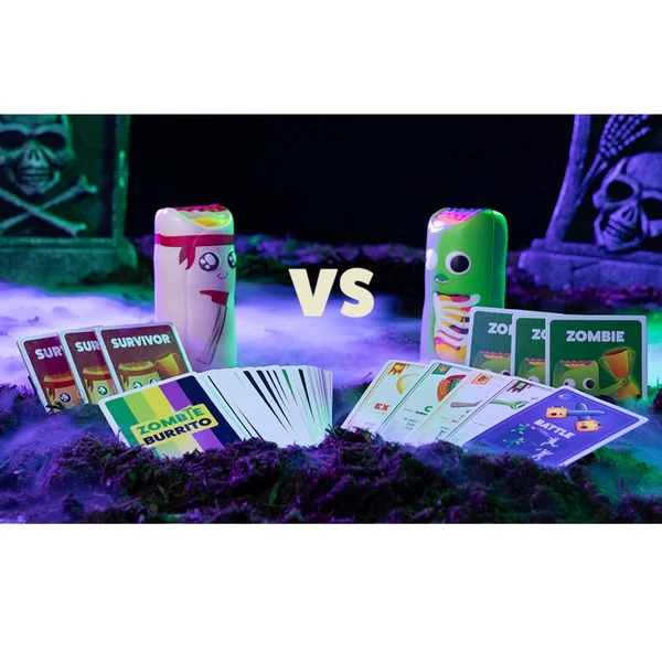 Plus c’est le chaos, plus c’est rigolo ! Cela pourrait être la devise de Zombie Burrito. Ce jeu d’ambiance fait s’affronter une équipe de Zombies et une équipe de Survivants (tirage au sort). Commencez par faire de la place autour de vous et rangez tous les objets fragiles, ça va déménager ! Chaque joueur reçoit une pioche de 15 cartes, prend les 5 premières cartes puis, au signal, tout le monde joue en même temps et s’échange les cartes le plus vite possible.